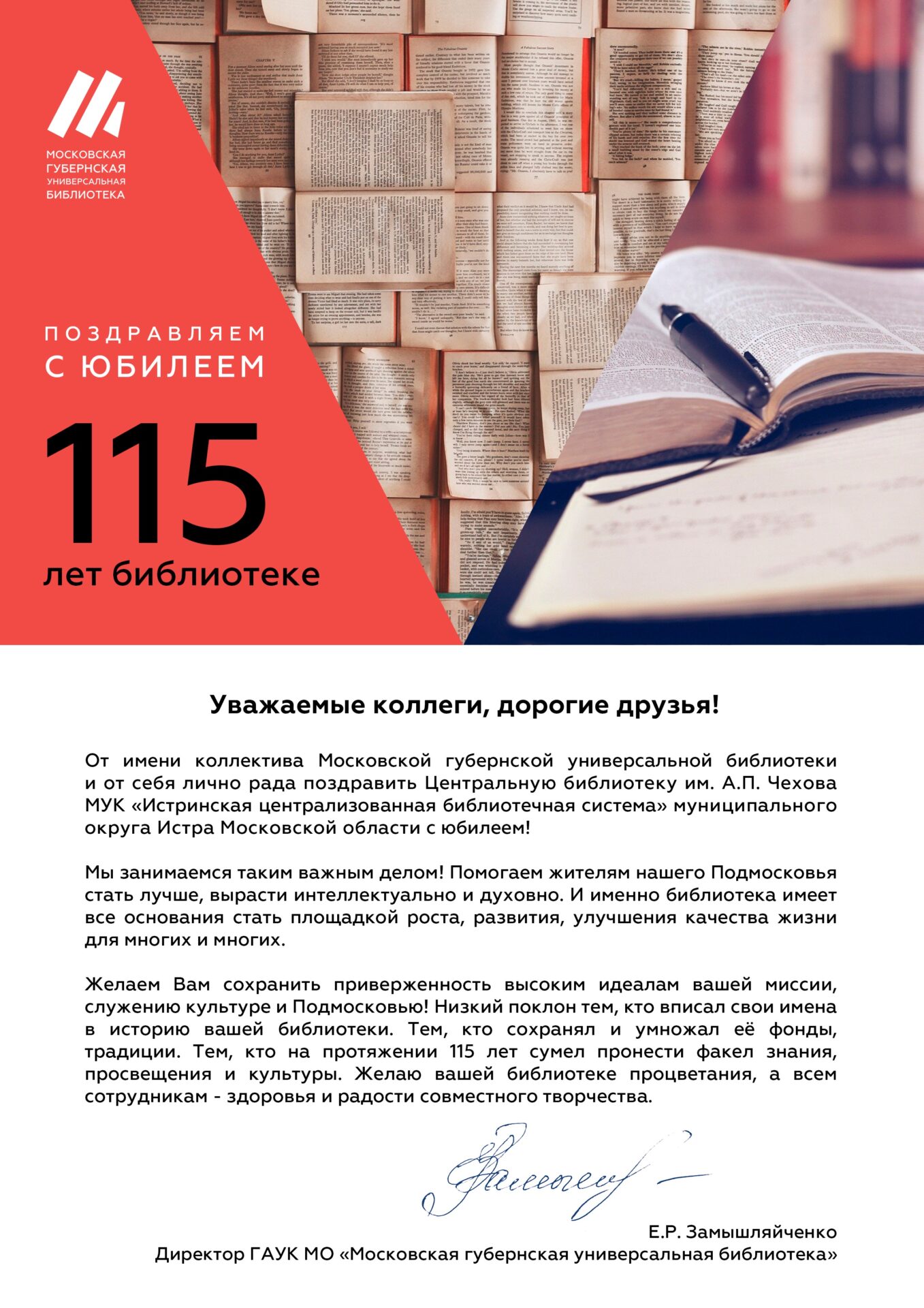 В этом году Истринской центральной библиотеке имени А.П. Чехова исполняется 115 лет. В связи с юбилейной датой мы получили поздравление от наших коллег – Московской губернской универсальной библиотеки. Предлагаем его вашему вниманию.