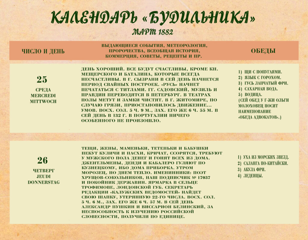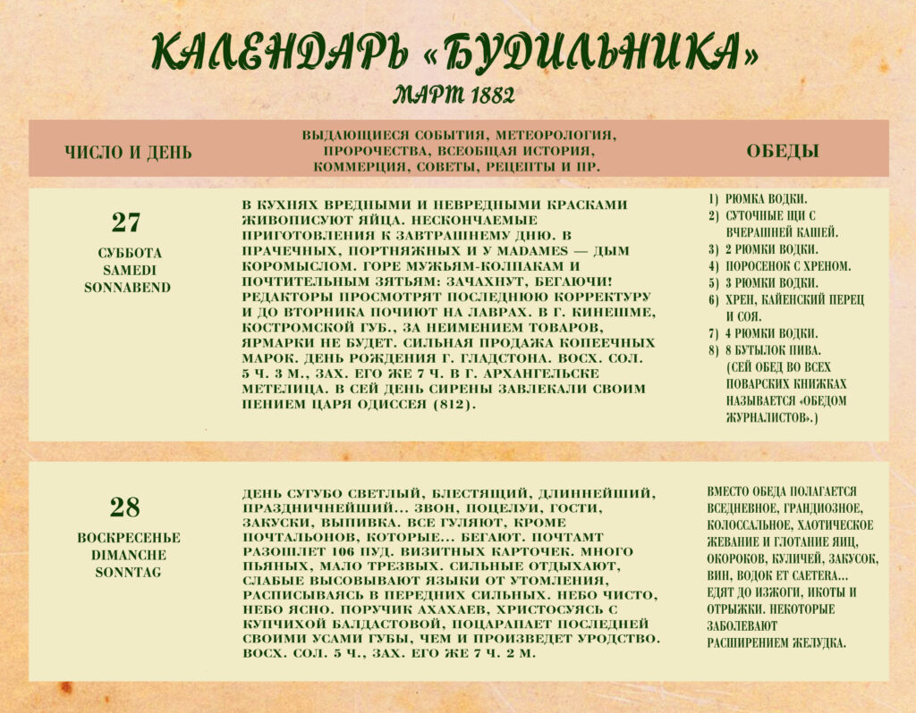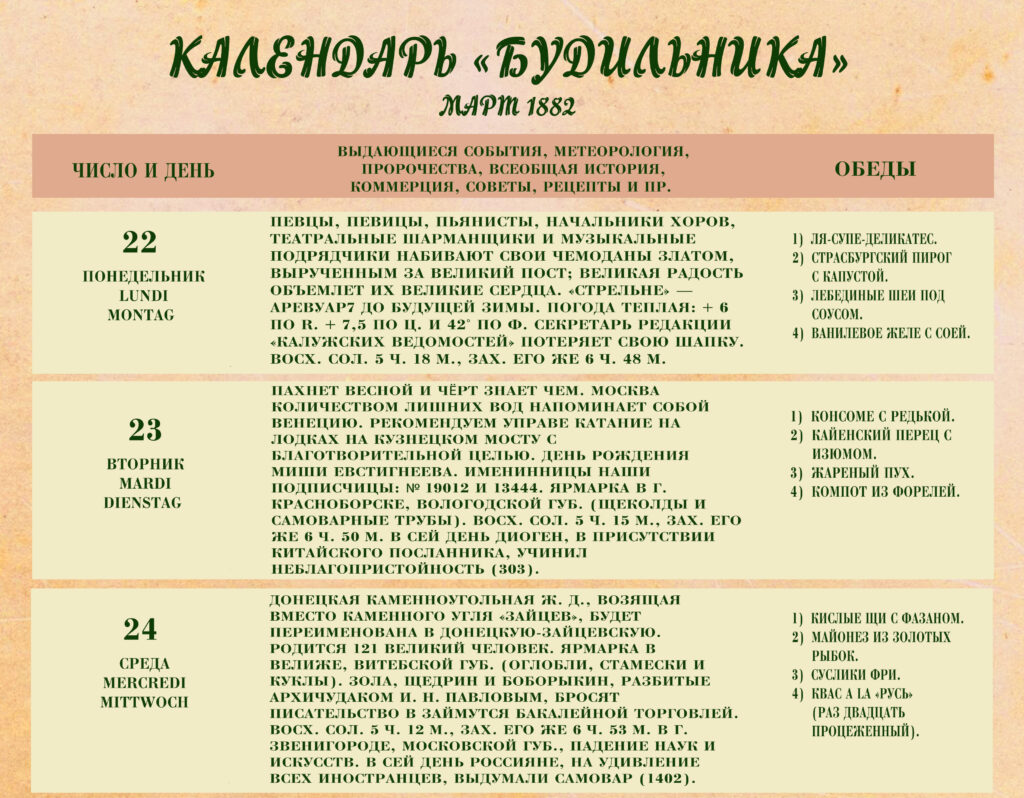 Третий выпуск «Календаря „Будильника“» под редакцией Антона Павловича Чехова посвящен праздничной, пасхальной неделе, которая в 1882 году выпала на период с 22 по 29 марта.