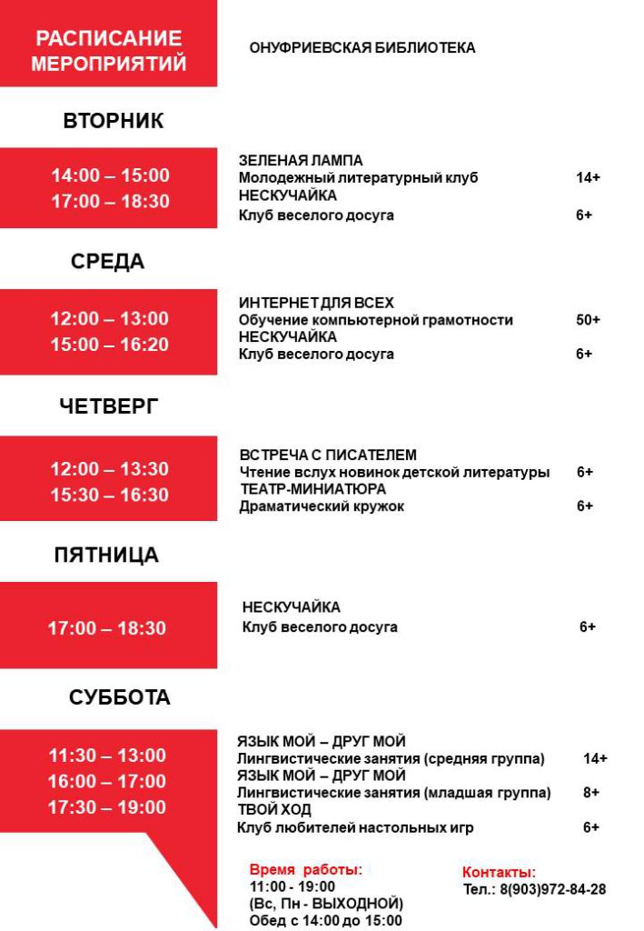 Онуфриевская библиотека предоставляет пользователям следующие услуги: выдает книги для чтения в помещении библиотеки и на дом, проводит различные культурные и досуговые мероприятия, организует работу кружков, предоставляет доступ к электронной библиотеке Литрес, доступ к УЭЧЗ НЭБ, возможность пользоваться бесплатным интернетом и Wi-Fi.